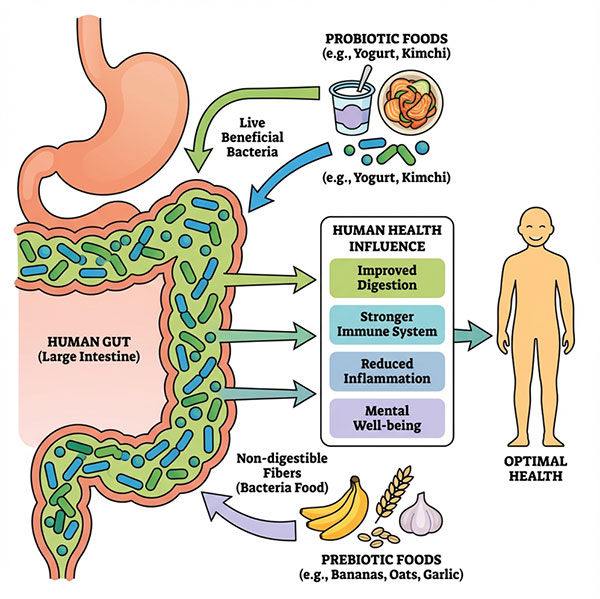 In addition to being probiotic, kimchi also functions as a prebiotic food. The vegetables used in kimchi—such as cabbage, radish, garlic, onion, and spring onion—are rich in dietary fiber and natural plant compounds that beneficial gut bacteria use as fuel. These prebiotic components help nourish and sustain the probiotic microorganisms already present in the digestive system, supporting their growth and activity over time.